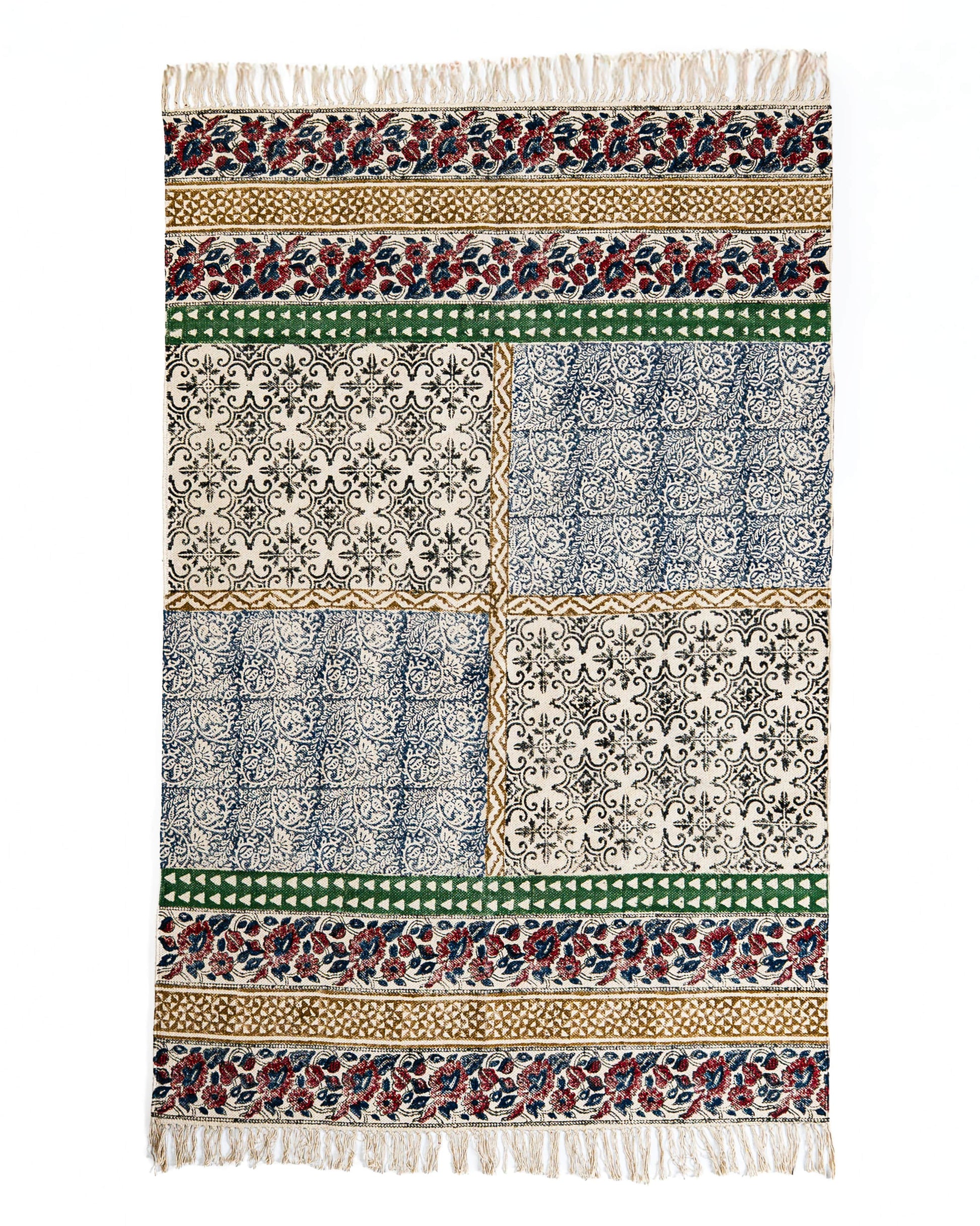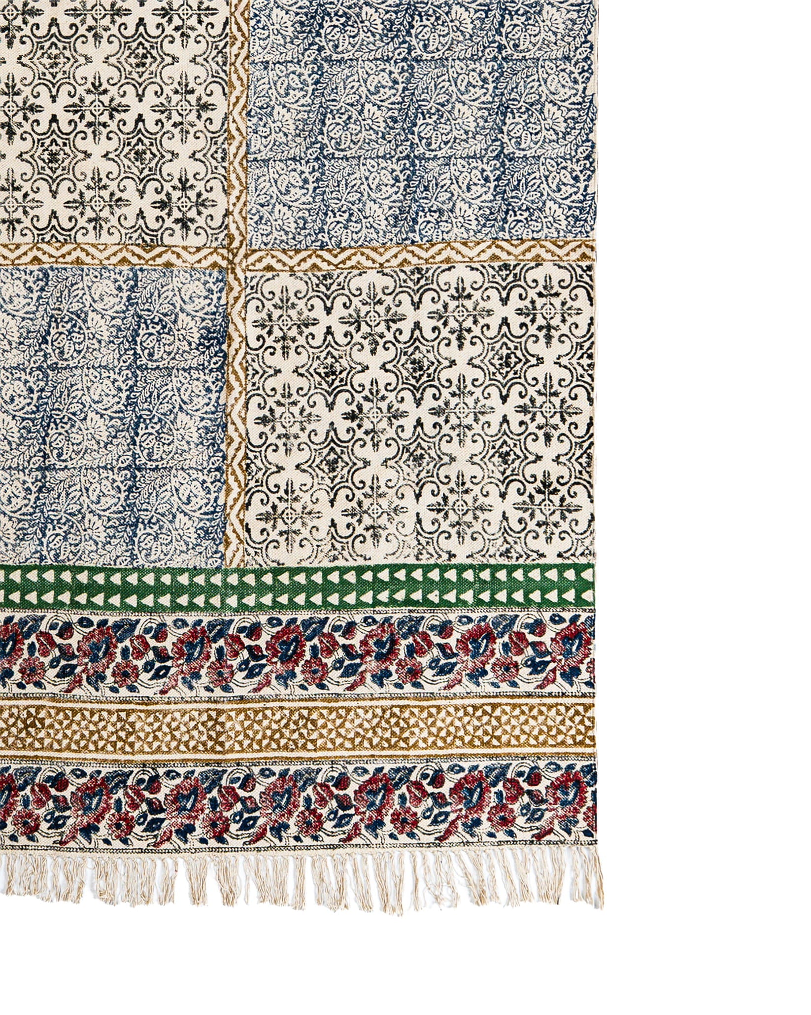 שטיח מודפס בעבודת יד בג'איפור, הודו, באמצעות טכניקה עתיקה שנקראת "בלוק פרינט", טכניקת הדפסה ידנית שבה משתמשים בחותמות כדי להעביר דוגמאות על בד.